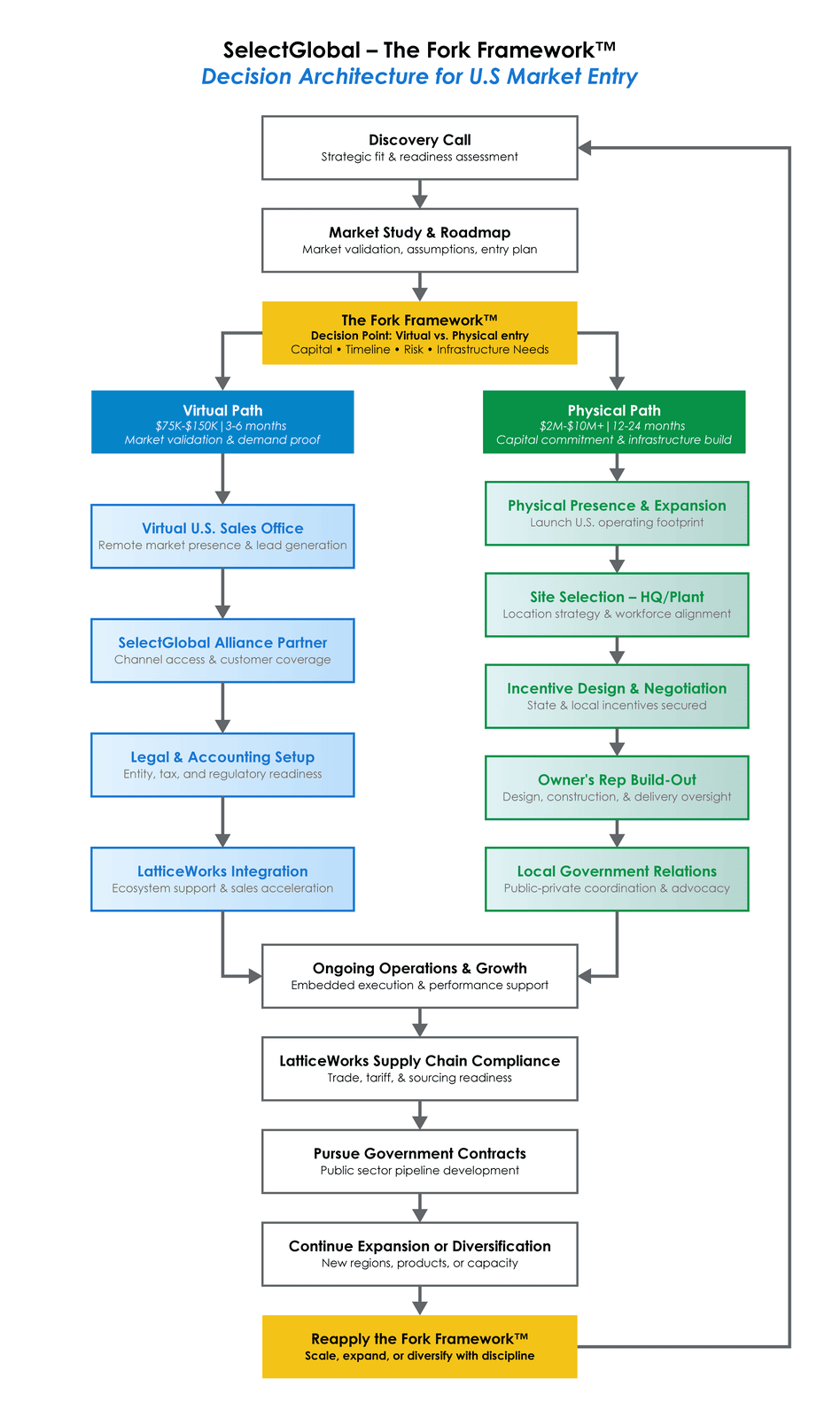 The Fork Framework™ is SelectGlobal’s proprietary decision architecture for U.S. market entry.
